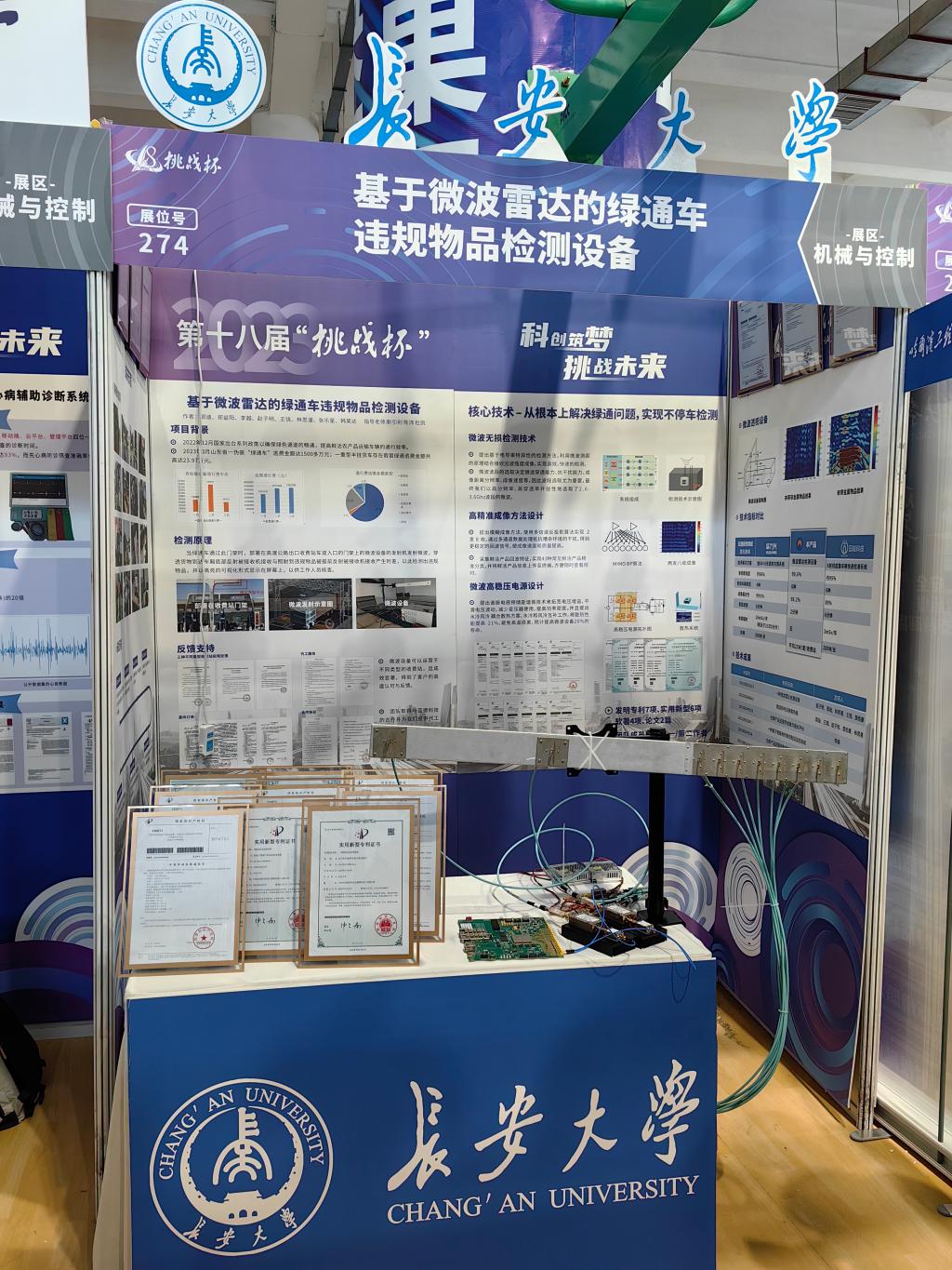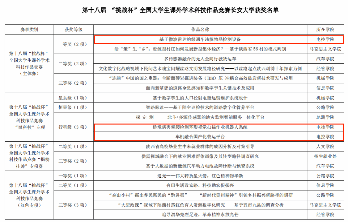 由我院靳引利教授等指导、本科生郭迪等完成的《基于微波雷达的绿通车违规物品检测设备》项目荣获第十八届“挑战杯”全国大学生课外学术科技作品竞赛主体赛一等奖,实现了学院历史性突破;由王会峰教授指导、研究生杜浩等完成的《桥墩病害攀爬检测环形视觉扫描作业机器人系统》、黄鹤教授指导、研究生谢飞宇等完成的《车机融合国产化载运平台》荣获“黑科技”专项赛行星级奖项。